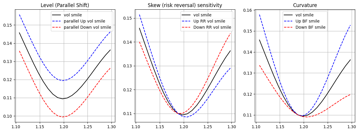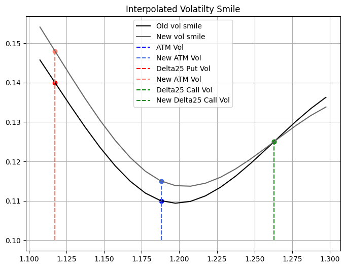 Now that we have setup our hedging portfolio, let’s verify how it will change as the spot and vol smile change. Let’s assume that in a week period the spot went go down by 300 pips, the ATM vol went up by \(0.5\%\) while the the 25 \(\Delta\) Put vol went up \(0.8\%\) (since the price to hedge from downside has went up because of the underlying so there is more demand for puts).